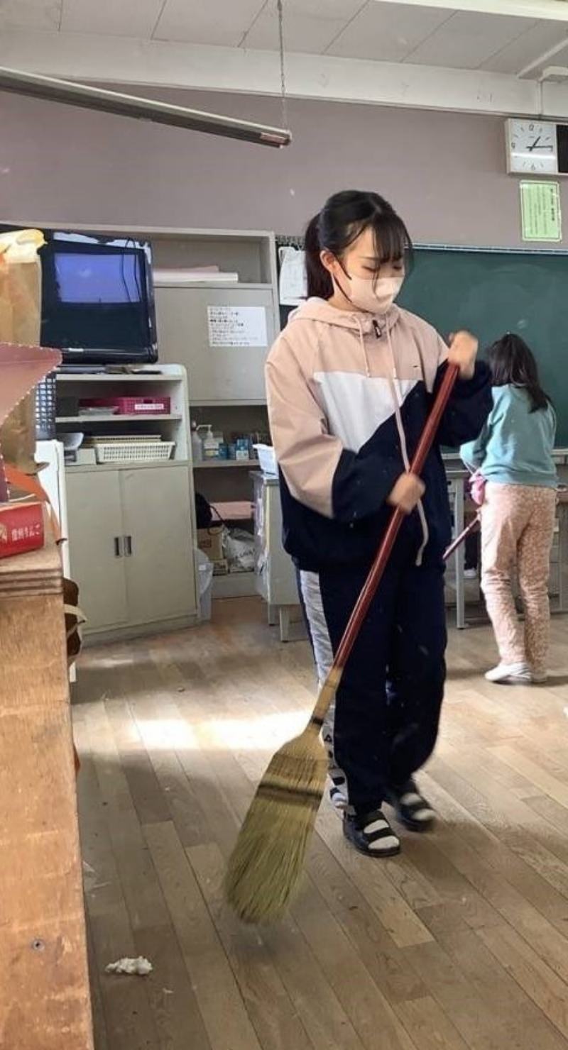 清掃時間に箒を使って教室の床を掃く茂木先生